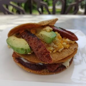 huevos a la california con tocino, cilantro, chile verde, papas salteadas y aguacate